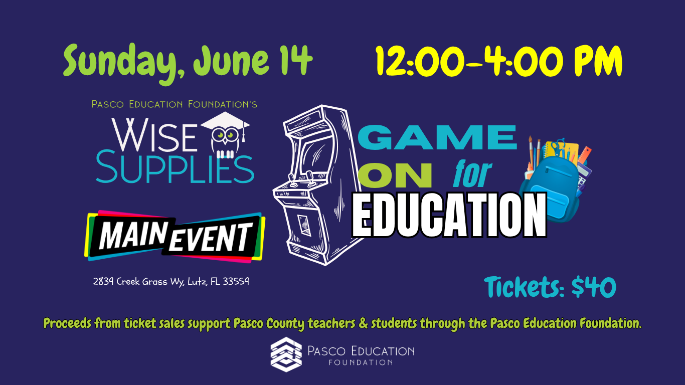 READ MOREThe Pasco Education Foundation’s Wise Supplies program is rolling through the summer with exciting events to support Pasco County teachers and students, like our upcoming event-𝐆𝐚𝐦𝐞 𝐎𝐧 𝐟𝐨𝐫 𝐄𝐝𝐮𝐜𝐚𝐭𝐢𝐨𝐧 𝐚𝐭 𝐌𝐚𝐢𝐧 𝐄𝐯𝐞𝐧𝐭 𝐖𝐞𝐬𝐥𝐞𝐲 𝐂𝐡𝐚𝐩𝐞𝐥! 𝐒𝐮𝐧𝐝𝐚𝐲, 𝐉𝐮𝐥𝐲 𝟐𝟕 | 𝟏𝟐–𝟒 𝐏𝐌 $40 gets you: $50 game card All-you-can-play laser tag, ropes course & bowling 2 slices of pizza + a drink A […]