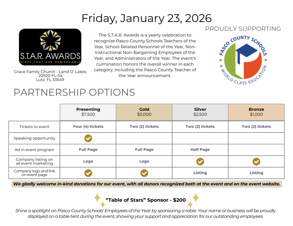 The S.T.A.R. Awards is a yearly celebration to recognize Pasco County Schools Teachers of the Year, School Related Personnel of the Year, Non-Instructional Non-Bargaining Employees of the Year, and Administrators of the Year. The event’s culmination honors the overall winners in each category, including the announcement of the Pasco County Teacher of the Year.