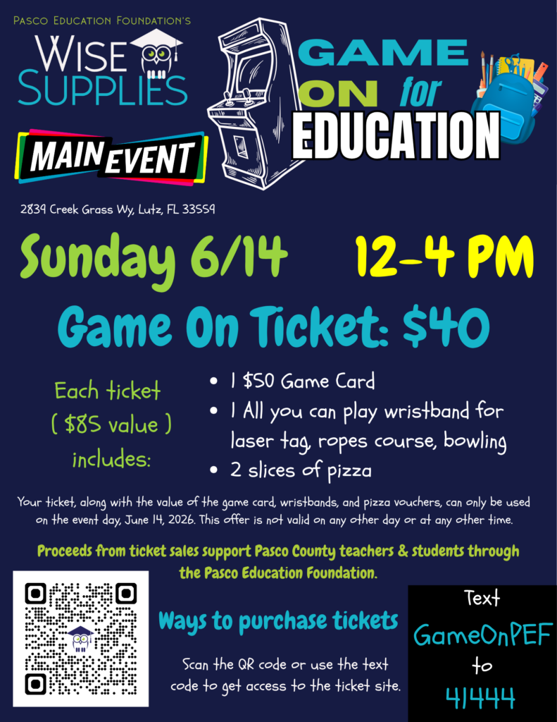 𝐆𝐚𝐦𝐞 𝐎𝐧 𝐟𝐨𝐫 𝐄𝐝𝐮𝐜𝐚𝐭𝐢𝐨𝐧 𝐚𝐭 𝐌𝐚𝐢𝐧 𝐄𝐯𝐞𝐧𝐭 𝐖𝐞𝐬𝐥𝐞𝐲 𝐂𝐡𝐚𝐩𝐞𝐥 will be a fun way to spend a day with your family and friends will supporting students and teachers fill their classrooms through the Pasco Education Foundation’s Wise Supplies Center.